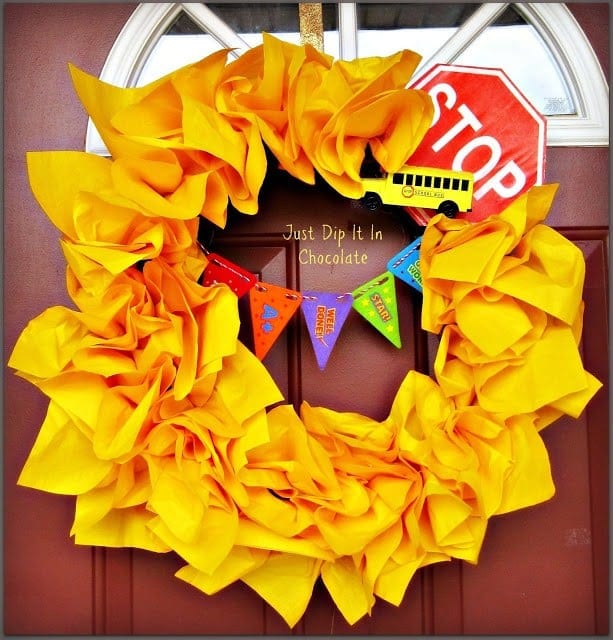 This bus stop wreath is made out of a surprising material: paper napkins! Once you get the basic concept down, you can easily create inexpensive variations throughout the school year.