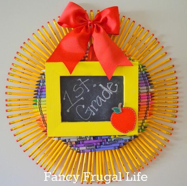 This wreath is a happy wreath! The no. 2 pencil rays make the wreath look like a giant sun, and the chalkboard frame lets you personalize your message. With a little hot glue and a super pack of pencils, you’ll be on your way.
