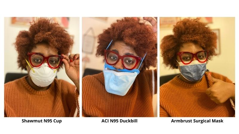 Other notes: “I have big hair, so headband masks were really hard to get over my head and sit nicely. I couldn’t keep the Gerson N95 mask on longer than a few minutes, and it was hard to get it off. However, my boyfriend wore the Shawmut N95 cup all day while cutting grass and loved it.”