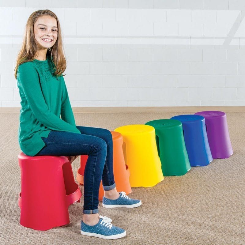 Looking for flexible seating options that will grow with your students? These stools are brilliant! You can buy them in 12-to-18-inch or 12-to-24-inch heights, in multiple colors. Simply add or remove center supports as needed. The slightly angled bottoms allow kids to wiggle quietly or use their core to hold the stool stable while they work.