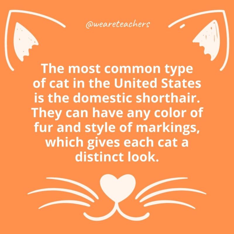 19. The most common type of cat in the United States is the domestic shorthair. They can have any color of fur and style of markings, which gives each cat a distinct look.