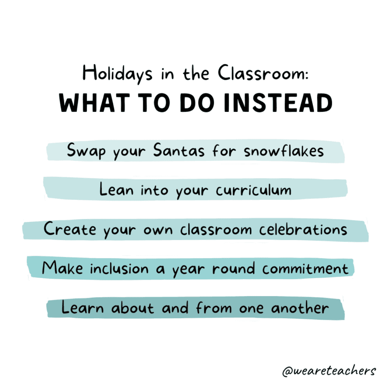When you bring in Christmas and Hanukkah, how do your Muslim and Hindu students feel? What about non-religious students? Does the way you teach Kwanzaa (do you really know what it’s all about?) actually make your Black students feel that their beliefs are being trivialized? When you limit your instruction to certain holidays, you also send the message that they matter more than others. It’s an exclusionary practice, it’s not culturally responsive, and it’s not OK.