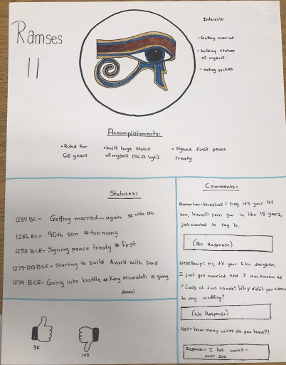 - Five Facebook-style statuses. For example: Hatshepsut is on her way to Punt for a trade expedition!