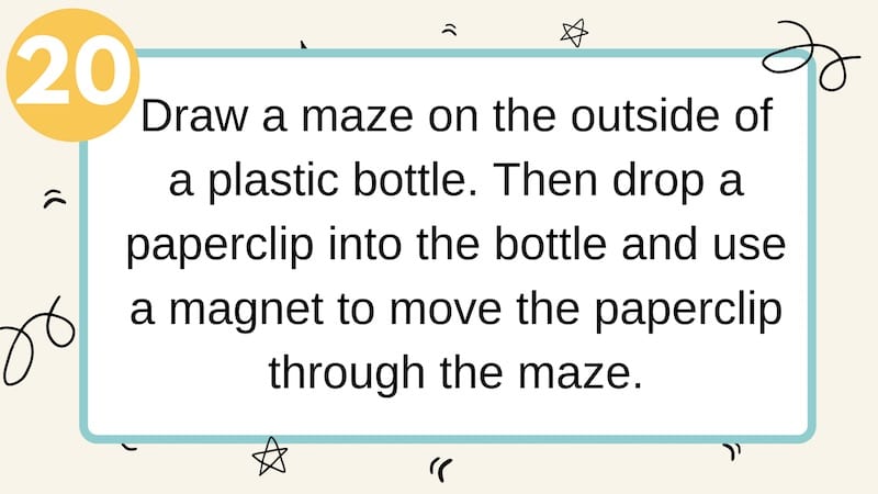 Draw a maze on the outside of a plastic bottle. Then drop a paperclip into the bottle and use a magnet to move the paperclip through the maze.