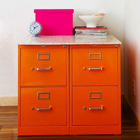 The easiest option by far to give your ugly file cabinet a face lift—a fresh coat of paint.
