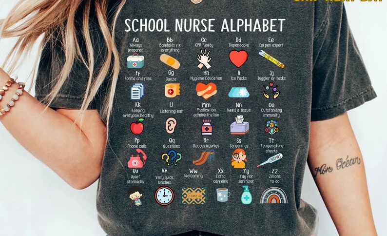 From “always prepared” to “zillions to do,” this tee captures a day in the life of a health room paraprofessional. Super-cute and maybe distracting in a good way for little ones coming in for help.