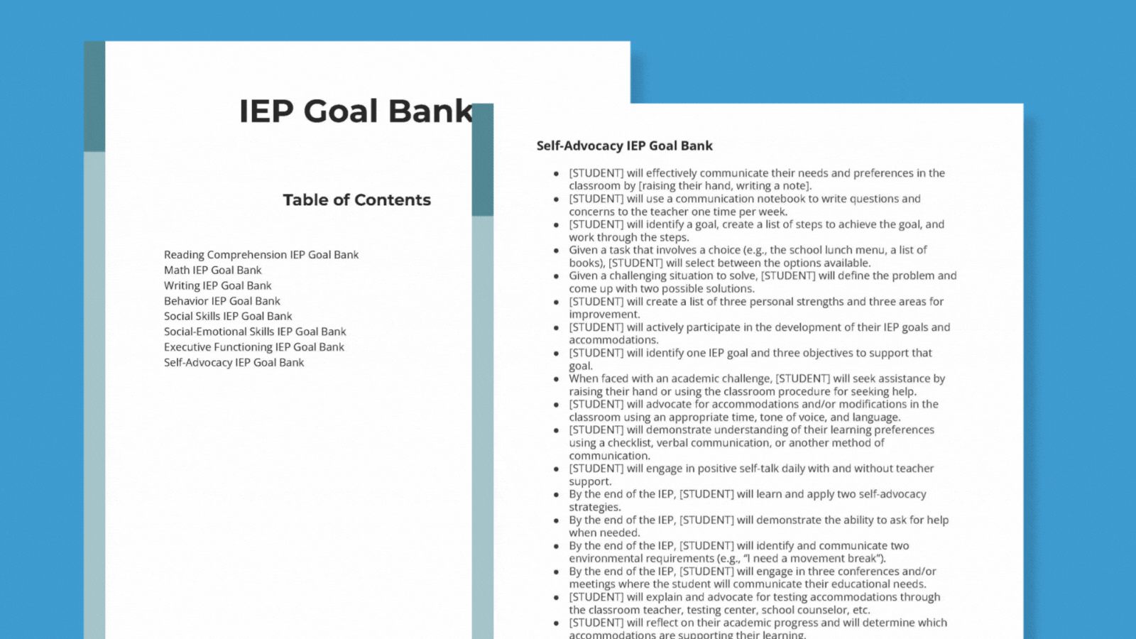 There are as many IEP goals as there are students. But the longer you teach special education, the more you’ll find yourself searching for just the right reading comprehension goal for a student who struggles with executive functions, or a student who needs to focus on writing. That’s where an IEP goal bank, also known as a goal database, comes in.