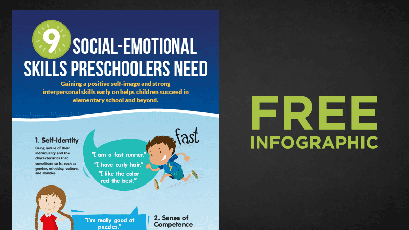 Download this free infographic to learn about the social-emotional skills, like empathy and conflict resolution, you can teach preschoolers to help them succeed in elementary school and beyond. Print and hang it in your classroom or share with parents to support your students in gaining a positive self-image and strong interpersonal skills early on.
