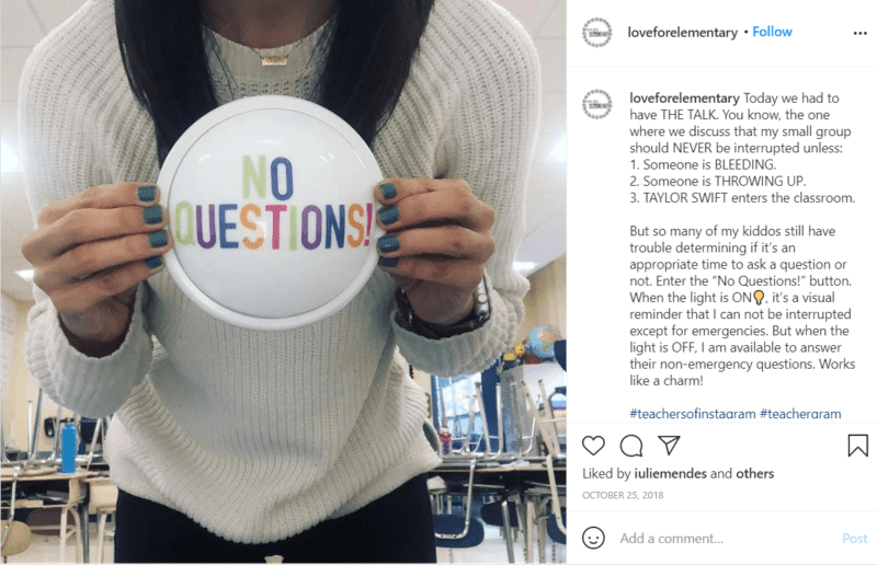 For when you are working with small groups or helping an individual student, post a picture of a light switch that is on if you’re available and off if you’re not. Or use an inexpensive LED puck light. Set the color to green when you’re available and red when you’re busy.