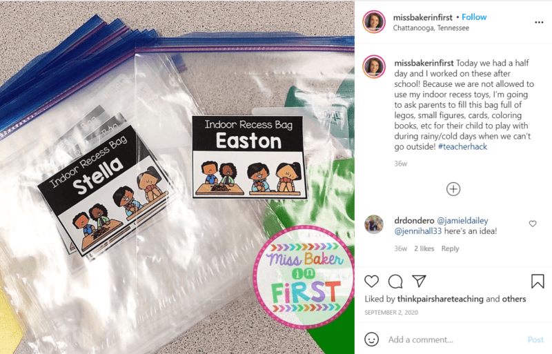 Students bored during indoor recess? Have parents send in a few small toys to keep them happy and occupied. Send home a large ziplock bag with the child’s name on it, and ask parents to send in a few toys that their child likes for indoor recess.