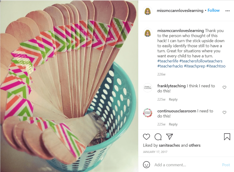 Popsicle sticks are another ever-useful tool. Write students’ names on them and use them to cold-call. Also use them as paint stirrers in art class or as counters in math class.