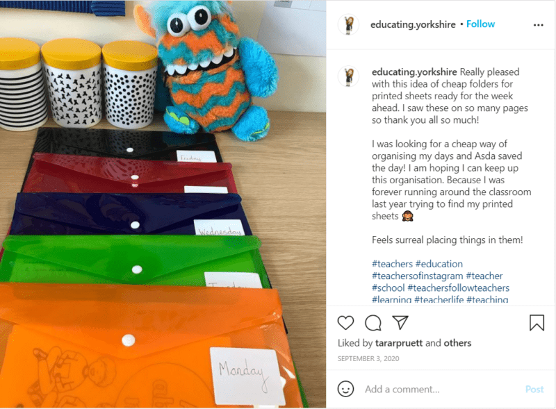 Organization is paramount. Use little bins to organize markers, pencils, and other school supplies. They’re ready to go when you need them, and you can quickly see what supplies haven’t made it back to you.