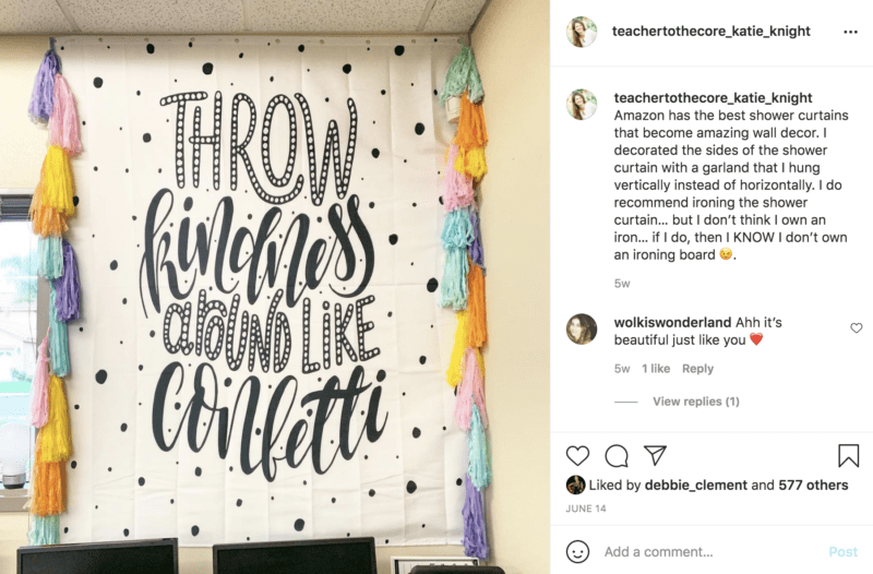 Shower curtains are way less expensive than regular curtains and are an easy way to spruce up any classroom wall.