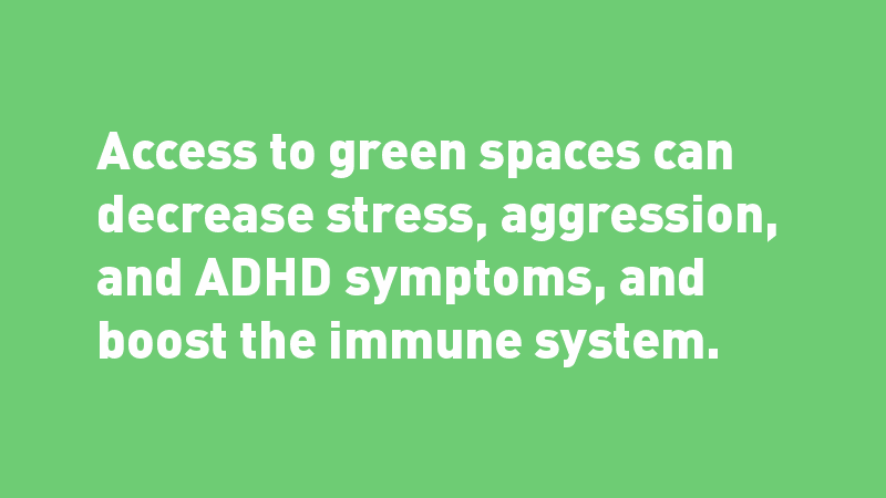 Numerous studies have shown the mental and physical benefits of spending time in nature. For children, access to green spaces can decrease stress, aggression, and attention deficit hyperactivity disorder symptoms and boost the immune system. The pandemic reminded us of the importance of spending time outside and connecting with the natural world.
