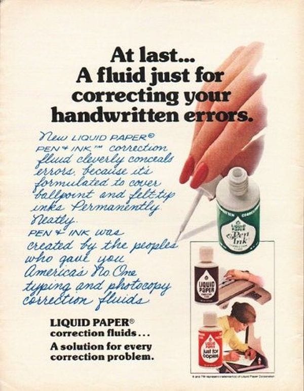 Some forms (like early IEPs) came with carbons to make several copies at once. If you made an error on the original top sheet, you could correct it with white correction fluid. But the copies underneath were usually a variety of other colors, like yellow, pink, or blue, meaning you needed a whole collection of correction fluid hues.