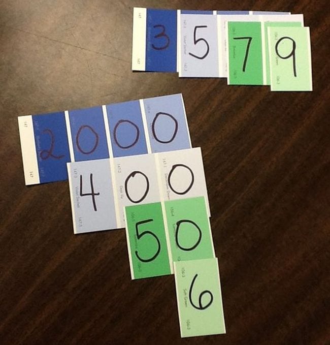 Here’s another way to use paint chips to talk about place value. This really helps students see how numbers break down into their constituent parts.