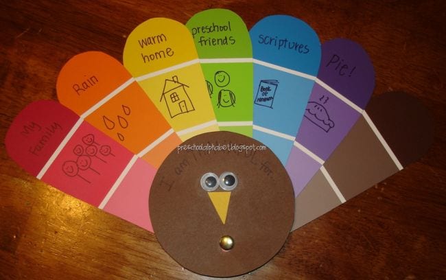 Turn paint chips into turkey tails! Write something you’re thankful for on each one, then attach them to the turkey body with a small brad fastener.