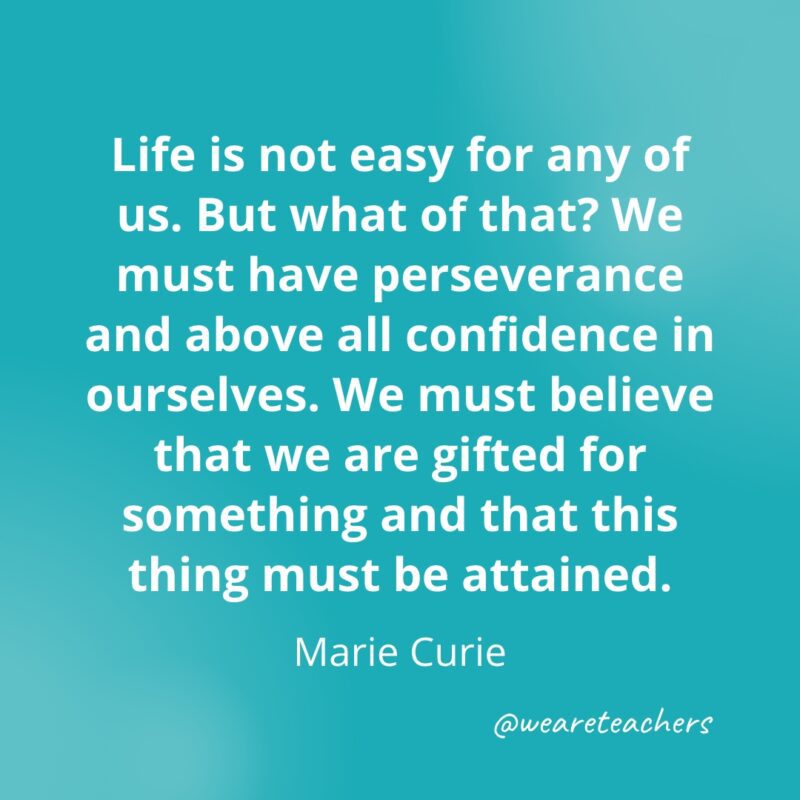 Life is not easy for any of us. But what of that? We must have perseverance and above all confidence in ourselves. We must believe that we are gifted for something and that this thing must be attained. —Marie Curie