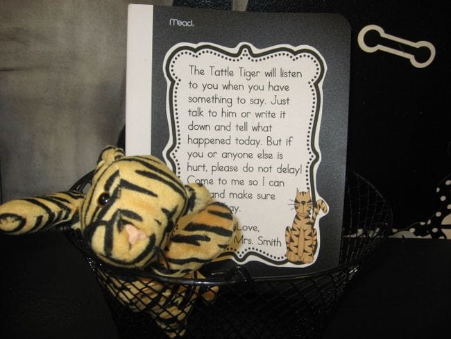 When you just can’t take one more tattle (“Gina broke the purple crayon!”), redirect kids to a Tattle Tiger. They can either whisper their problems to the tiger or write them down in the notebook. Just be sure they know to come to you directly if they or someone else is being hurt.