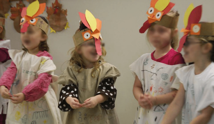 “The kids made their own headdresses with turkey gullets. This is my sweet girl and several of her friends.” —Dawn C.