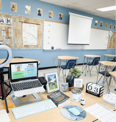We know you love that teacher mug from the holidays, but does it need to sit on your desk? Cutting down on the number of items you have will make you feel more organized as a whole. We know teacher desks can often get chaotic like pictured above during busy days, and getting rid of items that aren’t in use is a helpful tip to combat this.