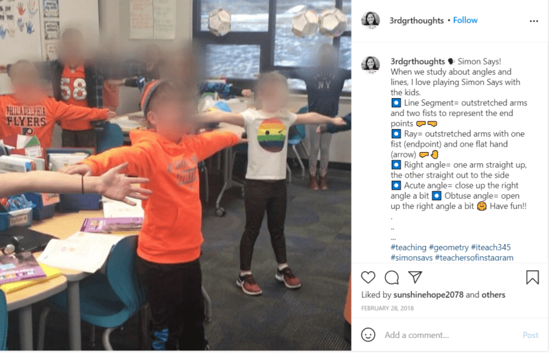 Are your students understanding the new math vocabulary you just covered? Have them use their whole body to show what they know through a game of Simon Says. Students in Stephanie’s class (below) play Simon Says to review vocabulary related to lines and angles.