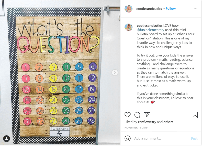 A fun twist on the usual exit ticket, a “What’s the Question?” wall invites students to create a question that matches the answer posted on the wall.
