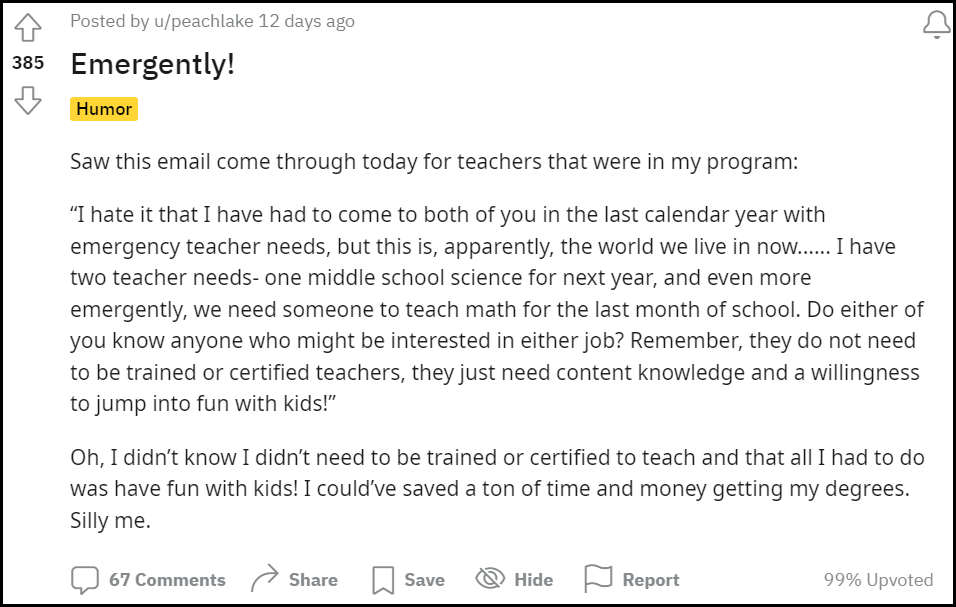 Don’t fret if you’re still confused about the “no training or certification needed” part of the email. As the administrator reminds us, the only two things people need to teach are “content knowledge and a willingness to have fun with kids!” We have to agree with u/peachlake’s assessment here: “Oh, I didn’t know I didn’t need to be trained or certified to teach and that all I had to do was have fun with kids! I could’ve saved a ton of time and money getting my degrees. Silly me.”