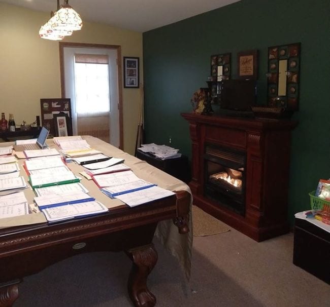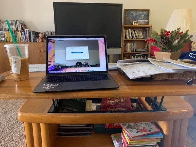 Christine W. is using her game room to prep packets for her preschoolers and teaching from a wingback chair in front of her laptop.
