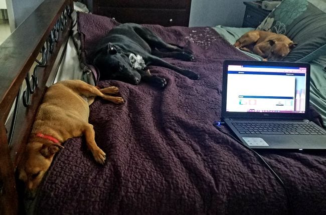 Emily L. had to turn her vanity into a virtual classroom. “But it turned out cute!” She also shares, “My pets are stoked that I’ve been home so much and my dog has been sleeping at my feet while I work all day.”