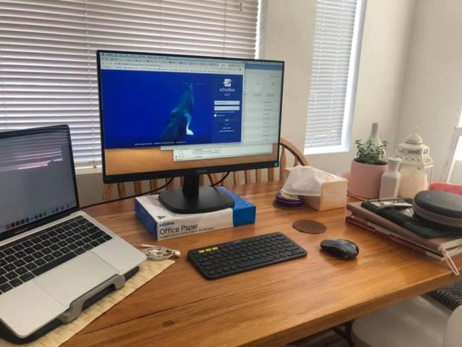 Most teachers aren’t used to sitting all day, but it’s a little different in a virtual classroom. Kimberly H.’s setup reminds us that you’ll want to make sure you have a supportive desk chair.