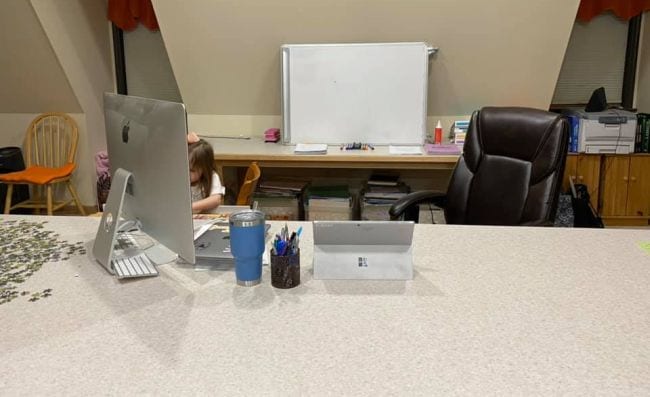 High school chemistry teacher Tim S. spends a full day teaching interactive classes on Zoom. “It will get interesting when I try to run chem labs from the office,” he notes. Let’s hope he brought home some protective gear along with that whiteboard.